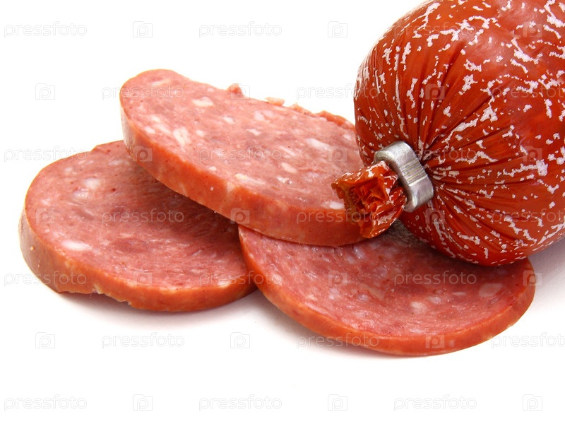 Нарезанная колбаса крупным планом на белом фоне