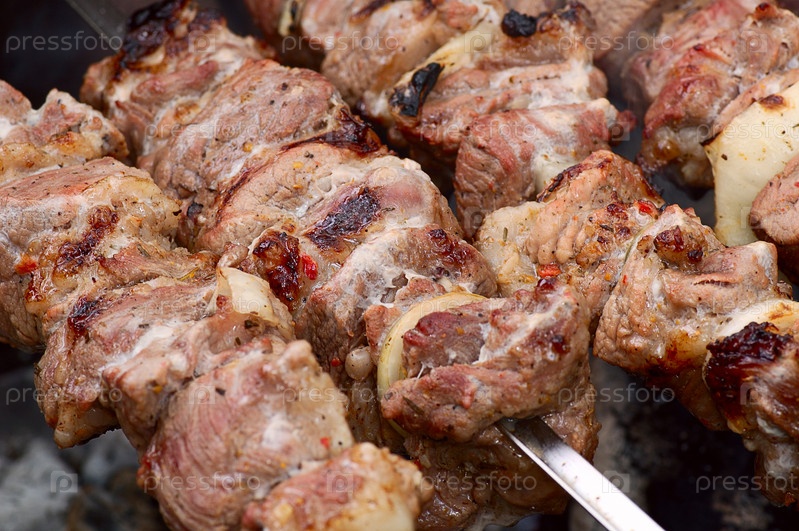 Процесс жарки шашлыка на мангале