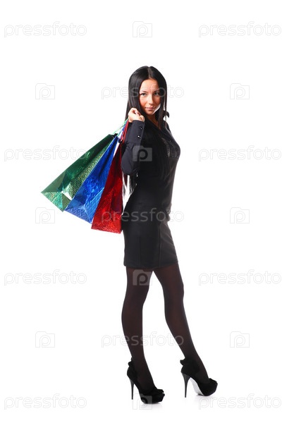Портрет молодой девушки с разноцветными пакетами на белом фоне