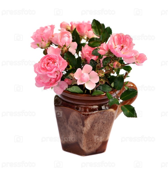 Горшок с миниатюрными розами крупным планом на белом фоне