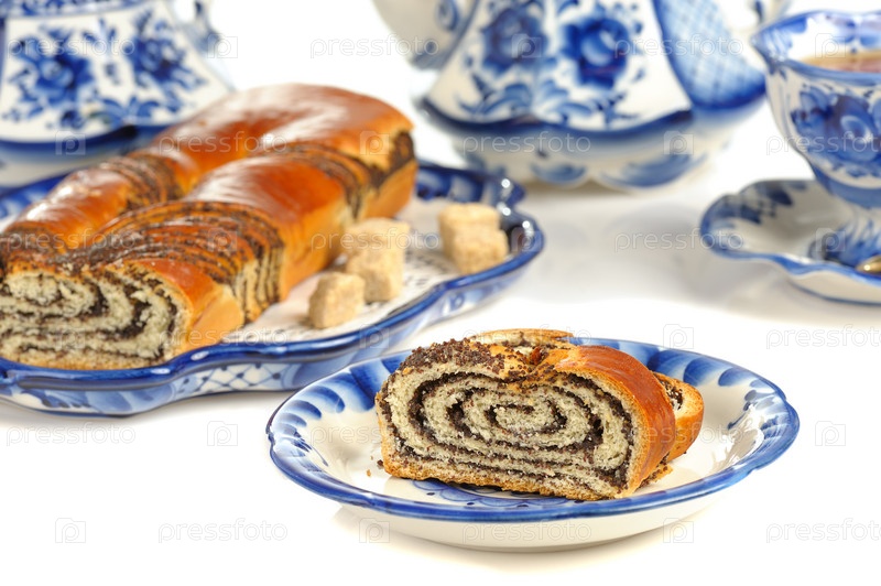 Кекс с маком и чайный сервиз крупным планом