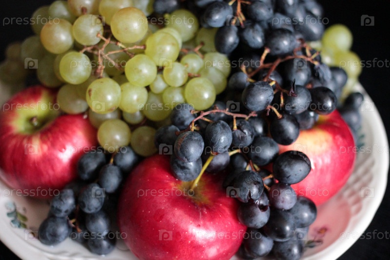 Спелый виноград и сочные яблоки как иллюстрация сбора урожая