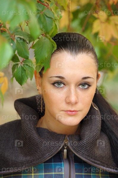 Молодая симпатичная брюнетка на улице осенью