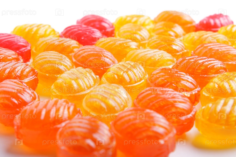 Сладкие желтые, красные и оранжевые конфеты на белом фоне