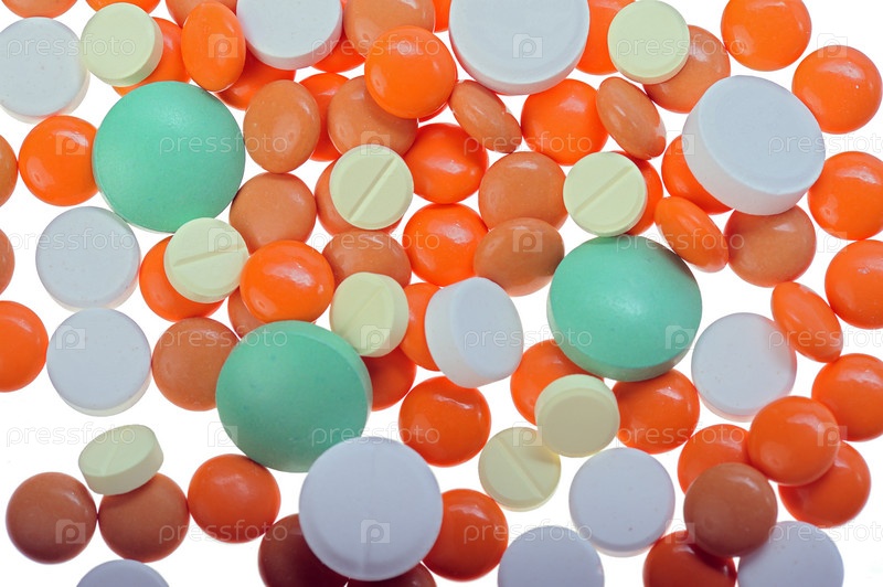 Разноцветные таблетки на белом фоне