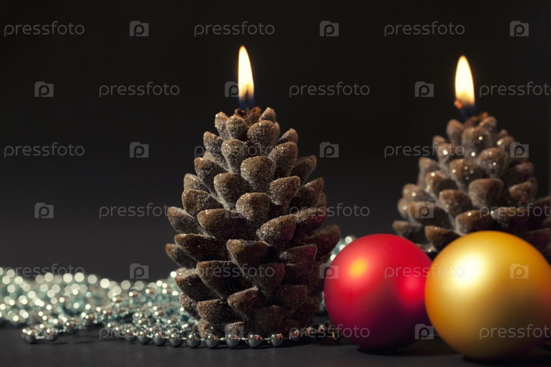 Горящие свечи с елочными украшениями