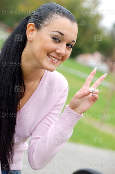 Портрет девушки, показывающей жест "мир"