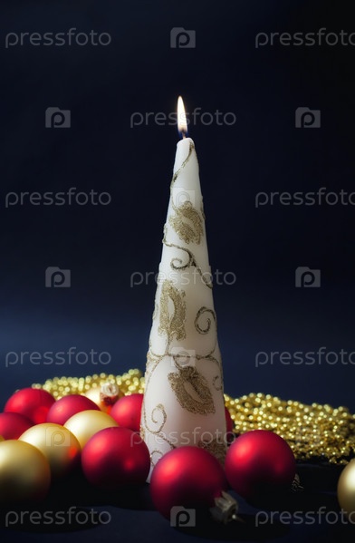 Горящая свеча и елочные игрушки