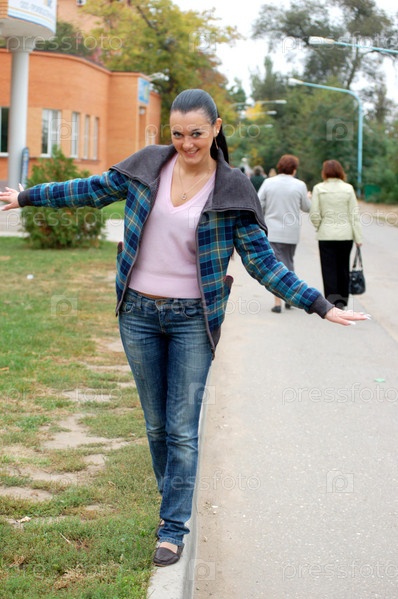 Портрет длинноволосой брюнетки, идущей по бордюру