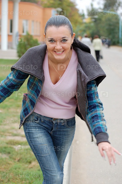 Портрет длинноволосой брюнетки, идущей по бордюру