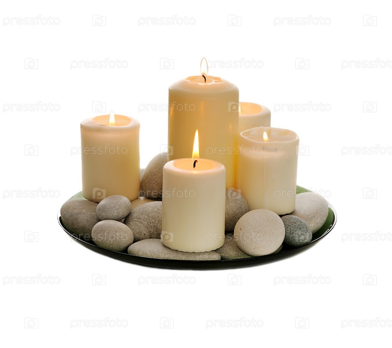 Поднос с белыми зажженными свечами и галькой