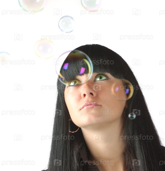 Портрет молодой девушки и мыльные пузыри на белом фоне