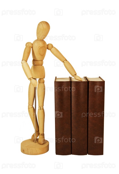 Деревянный манекен и куча старых книг изолированы на белом фоне