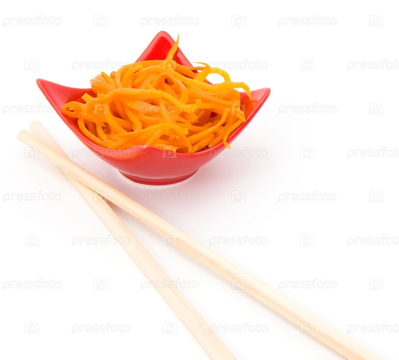 Морковь в пиале и палочки для еды на белом фоне