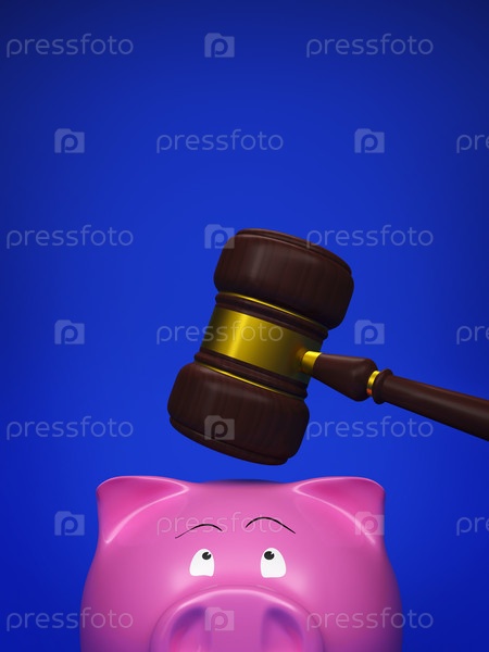 Копилка и молоток на синем фоне