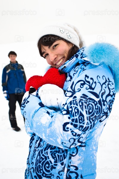 Улыбающаяся девушка с красным сердцем в зимней одежде