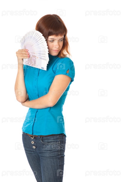 Девушка с деньгами в руках на белом фоне