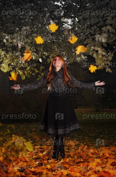 Молодая женщина жонглирует осенними листьями в лесу