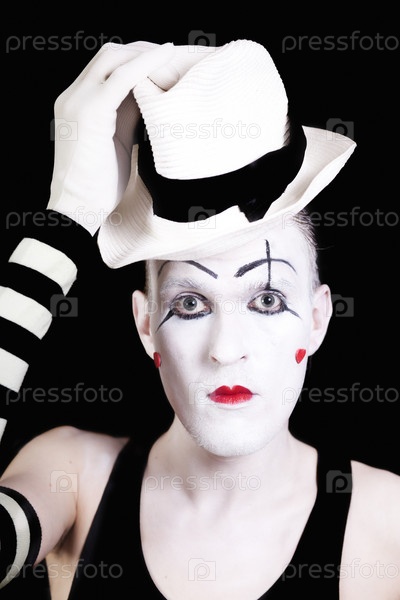 Мим с красными губами и белой шляпой на черном фоне