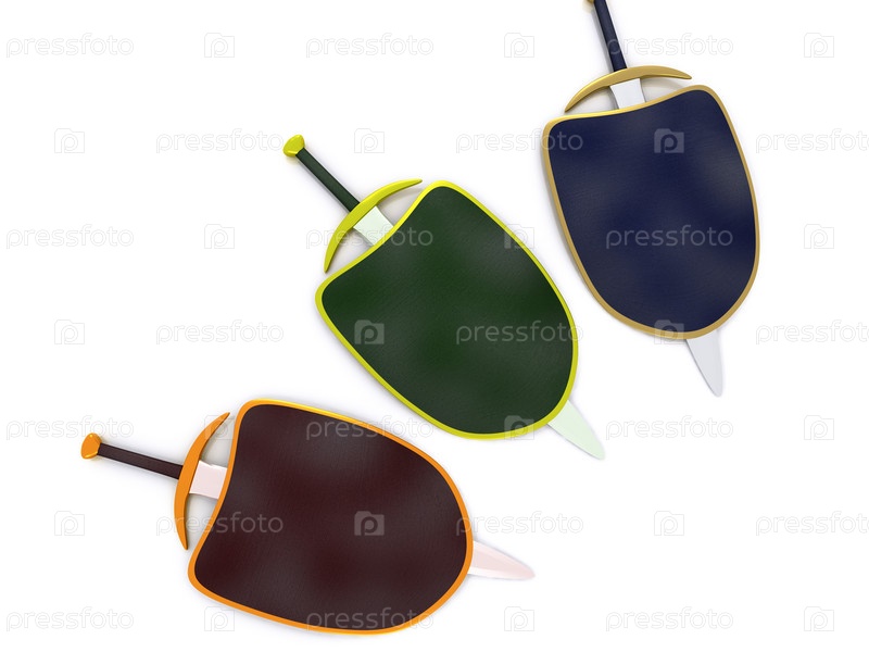 Три меча со щитами в крупном плане на белом фоне, 3D