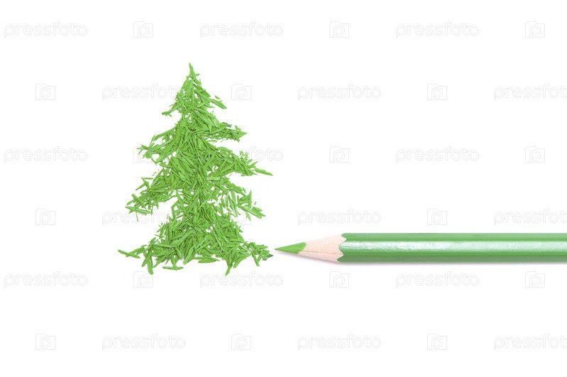 Зеленый карандаш и елка из зеленых опилок на белом фоне