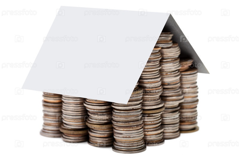 Домик из монет на белом фоне