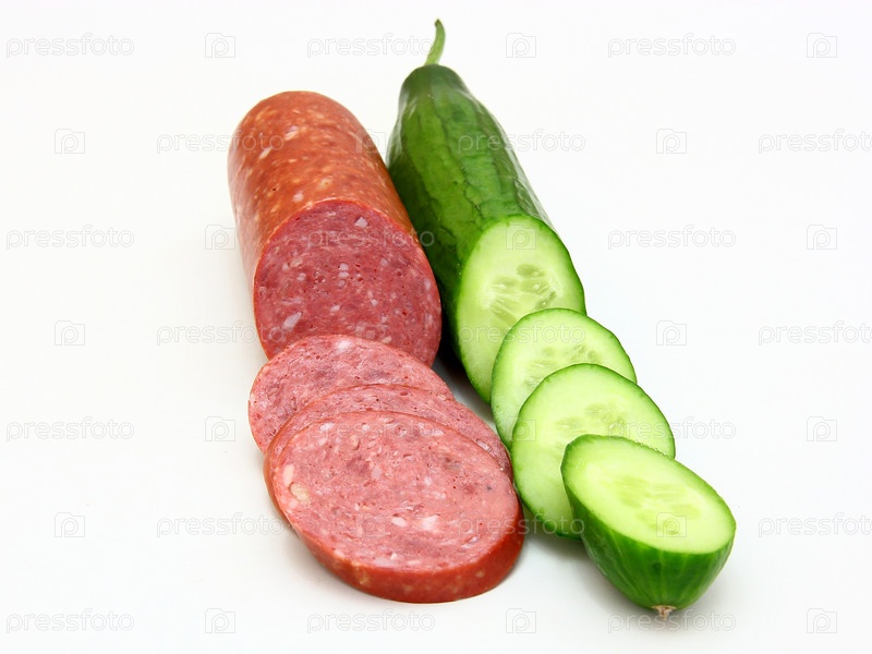 Колбаса и огурцы на белом фоне