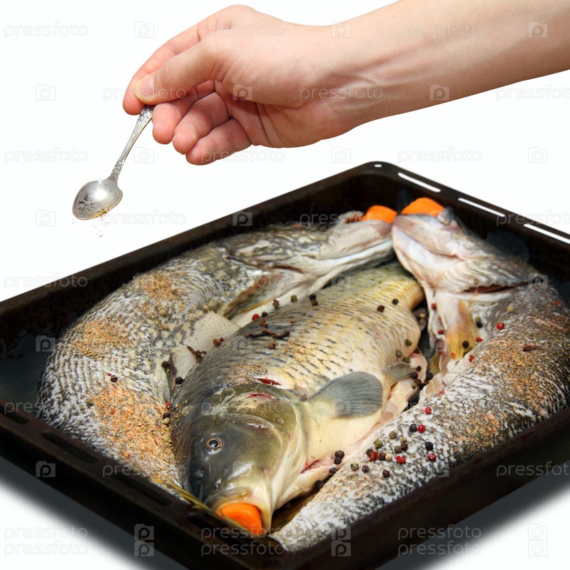 Приготовление рыбы на белом фоне