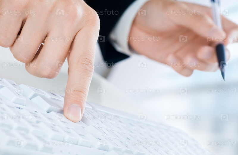 Близкий снимок руки секретарши, касающейся клавиш компьютера