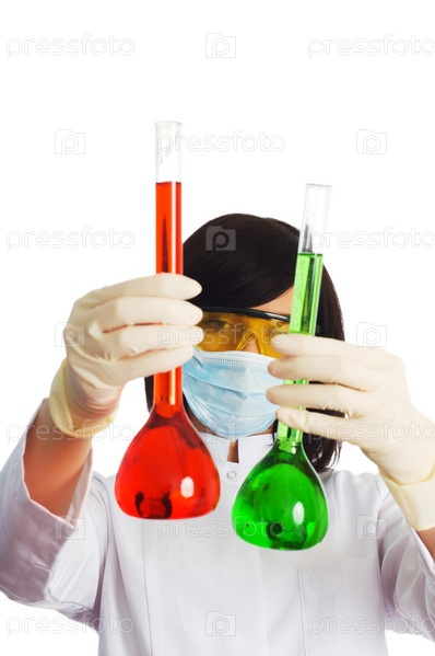 Девушка с химическими колбами в лаборатории