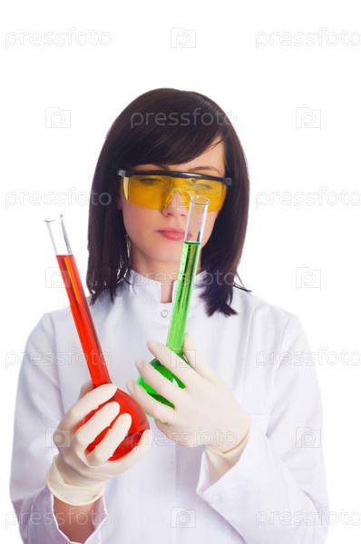 Девушка с химическими колбами в лаборатории