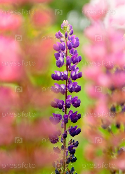 Фиолетовый люпин в саду среди розовых цветов