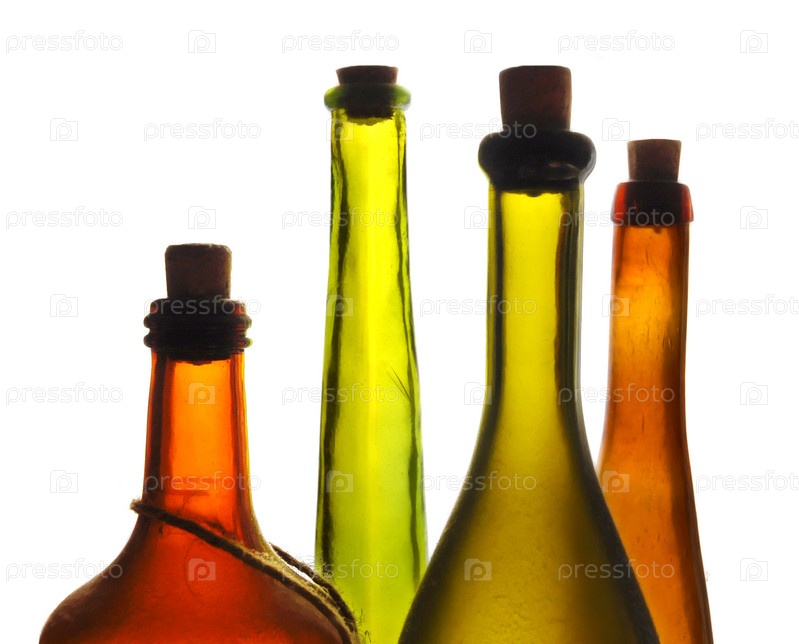 Старые многоцветные бутылки вина изолированы на белом