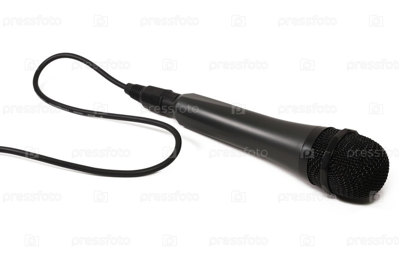 Рука женщины, держащей динамический черный микрофон с кабелем, изолирована на белом фоне