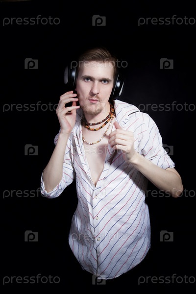 Молодой человек в наушниках на черном фоне