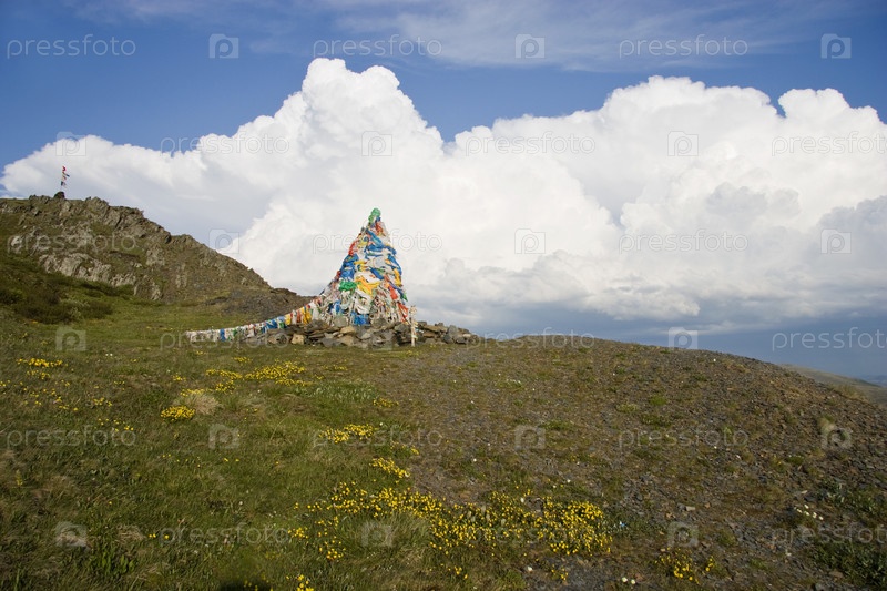 Пирамида из камней и молитвенные буддийские флаги