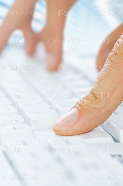 Близкий снимок руки секретарши, касающейся клавиш компьютера