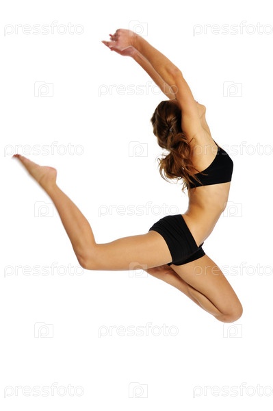 Портрет молодой гимнастки в прыжке на белом фоне