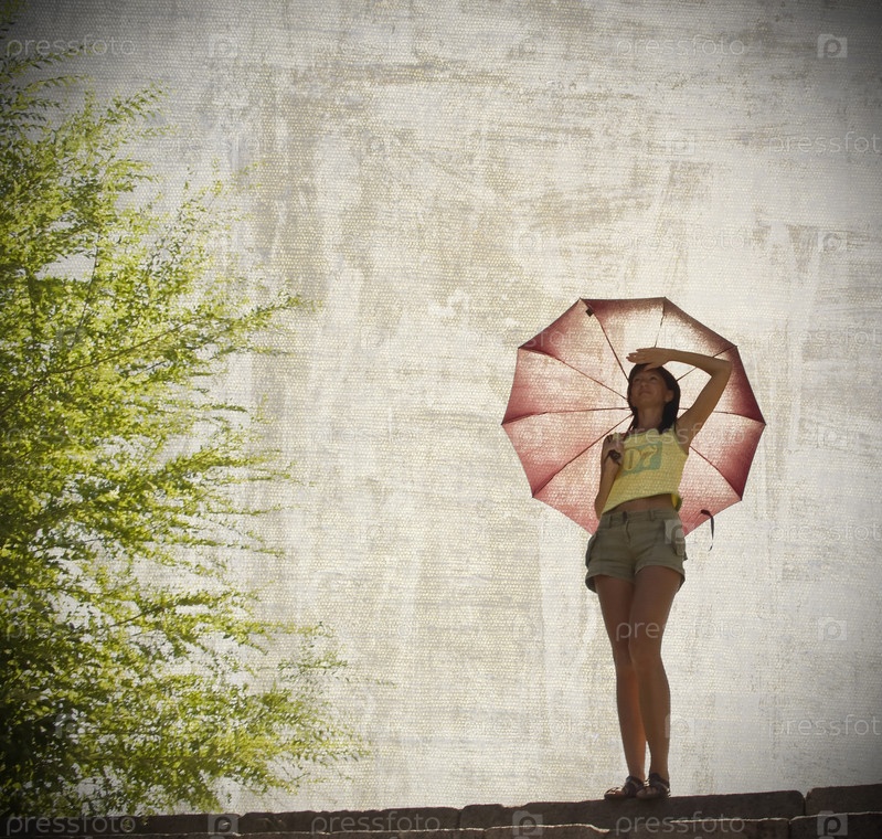 Молодая девушка с зонтиком в руках на фоне абстрактного серого неба