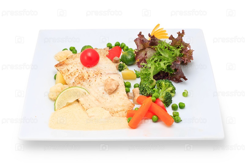 Морепродукты с зеленью и овощами на тарелке крупным планом