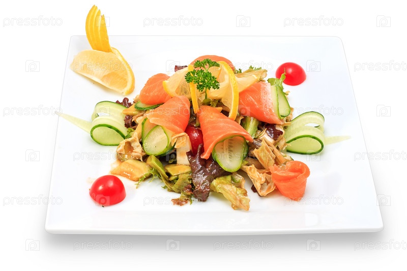 Салат из морепродуктов на белой тарелке