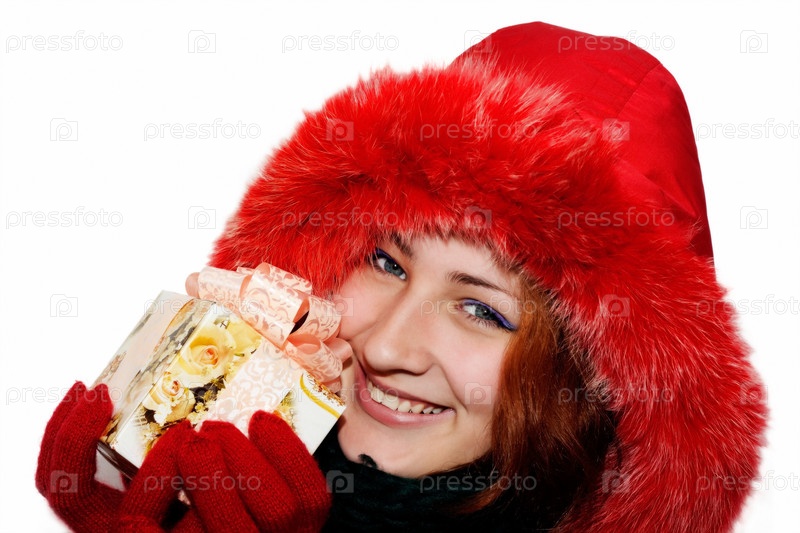 Портрет молодой девушки в красном капюшоне с подарком в руках на белом фоне