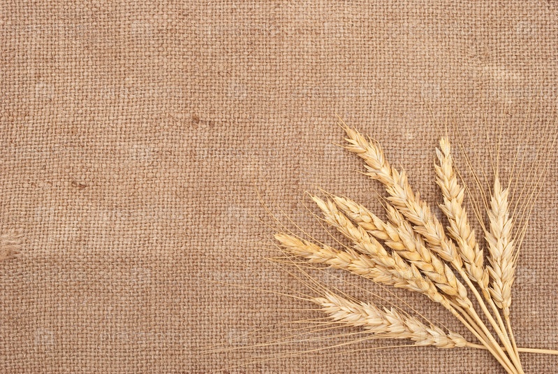 Колосья пшеницы крупным планом на фоне из мешковины