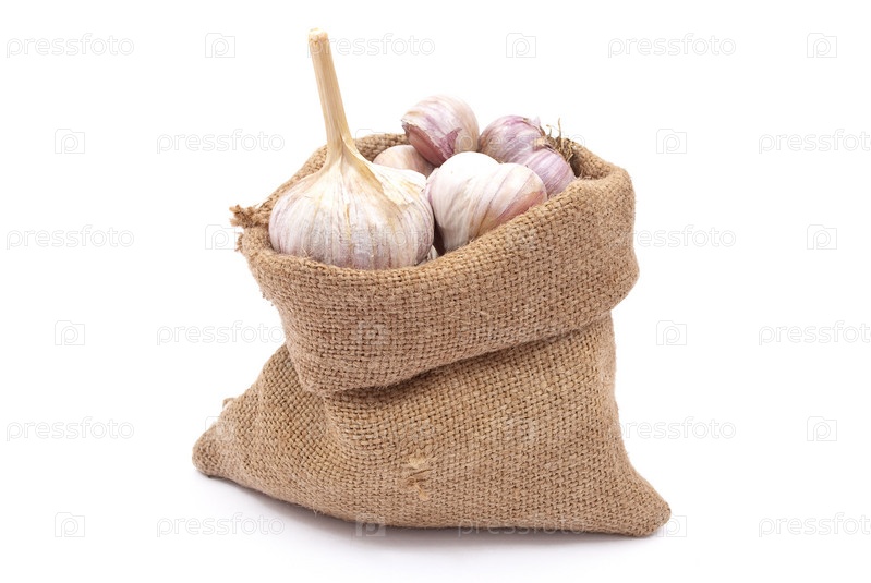 Полный мешочек чеснока на белом фоне