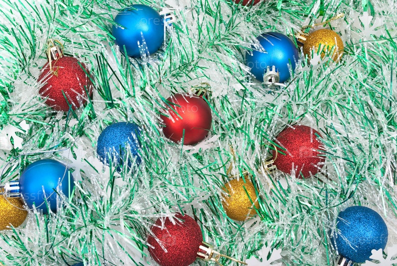 Яркие рождественские шарики на фоне из мишуры крупным планом