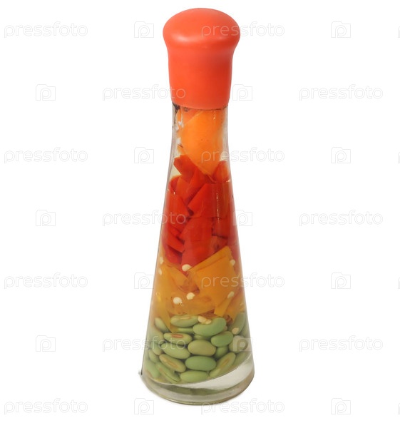 Декоративная запечатанная бутылка с чесноком, бобами, перцем и другими овощами внутри изолированной на белом