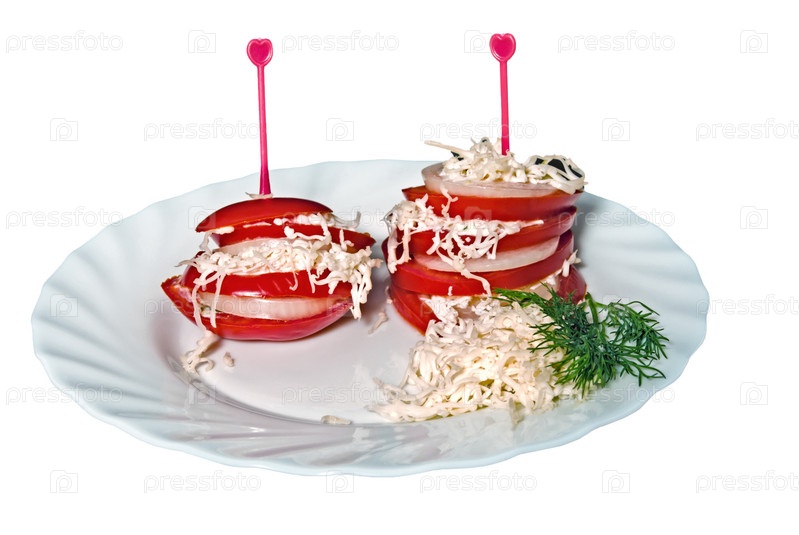 Холодная закуска из нарезанных помидоров, сыра и лука на белой тарелке