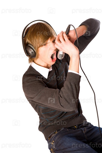 Портрет молодого человека в наушниках, поющего в микрофон