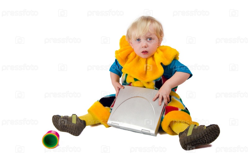 Портрет ребенка в костюме клоуна, сидящего на полу с ноутбуком