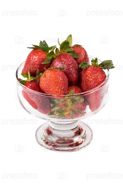Свежая спелая клубника в стеклянной вазочке на белом фоне